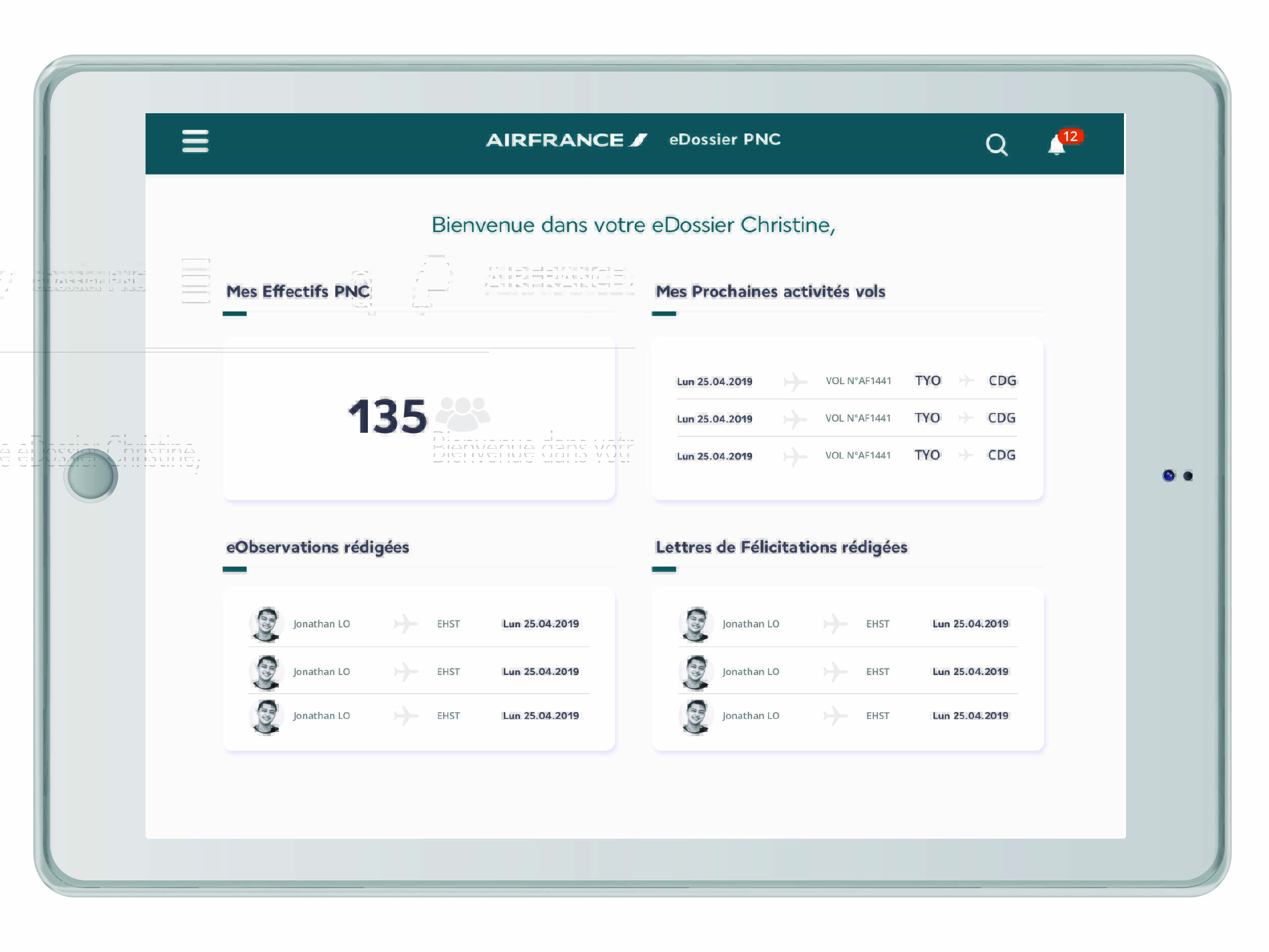 Application de management qui centralise le dossier pro PNC (Personnel Naviguant Commercial), elle permet à l’instructeur d’accompagner le PNC dans le développement de ses compétences et au PNC de consulter son dossier professionnel.