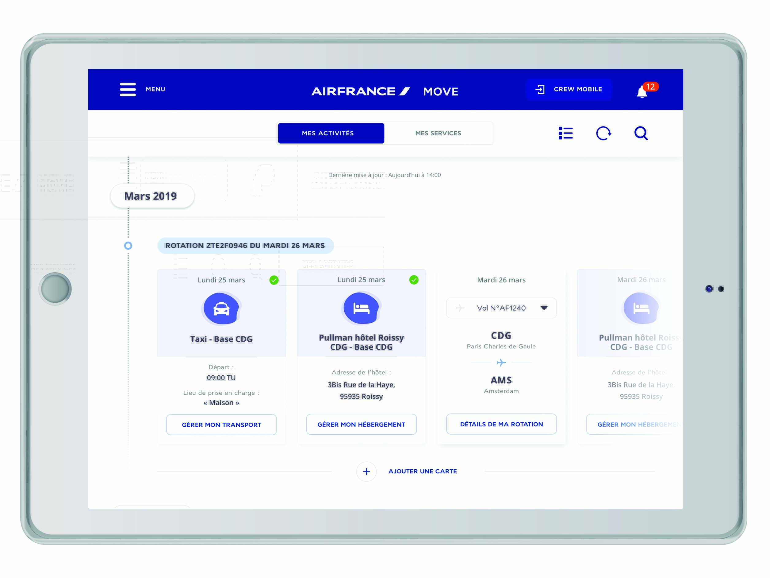 Application gérant la logistique du personnel navigant (transport, logement), fonctionnalités principales : Accès billets dématérialisé, modification des vouchers transports, réservation/ Modification de l’hébergement, gestion du pressing.
